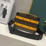 핸들 소프트 트렁크는 모노그램 마카사르 캔버스에 수평 밴드와 샤프란 색상 가죽의 상단 손잡이를 사용하여 제작되었습니다.하드웨어는 무광 검은색이며, 여기에는 보강 모서리와 수평 밴드의 리벳이 포함됩니다.'Lo□is Vuitt□n'이라고 서명된 조절 가능하고 탈부착 가능한 직물 스트랩은 숄더 캐리를 가능하게 합니다.