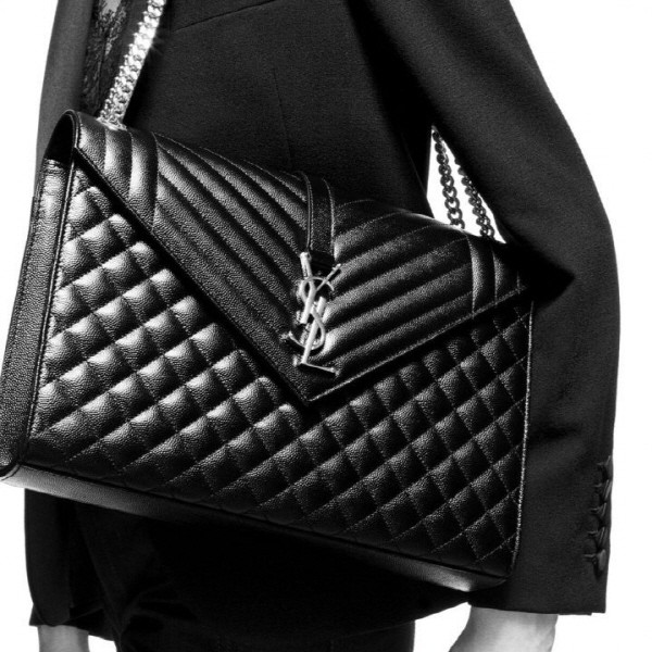 그랑 드 뿌드르 가죽 소재의 라지 ENVELOPPE 플랩 백, 헤링본 및 마름모 퀼팅 탑스티치 디테일.