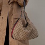디테일: 구찌의 상징인 초록색과 빨간색의 웹(Web) 스트라이프가 측면에 배치되어 있으며, 실버 또는 골드 톤의 하드웨어가 사용되었습니다.